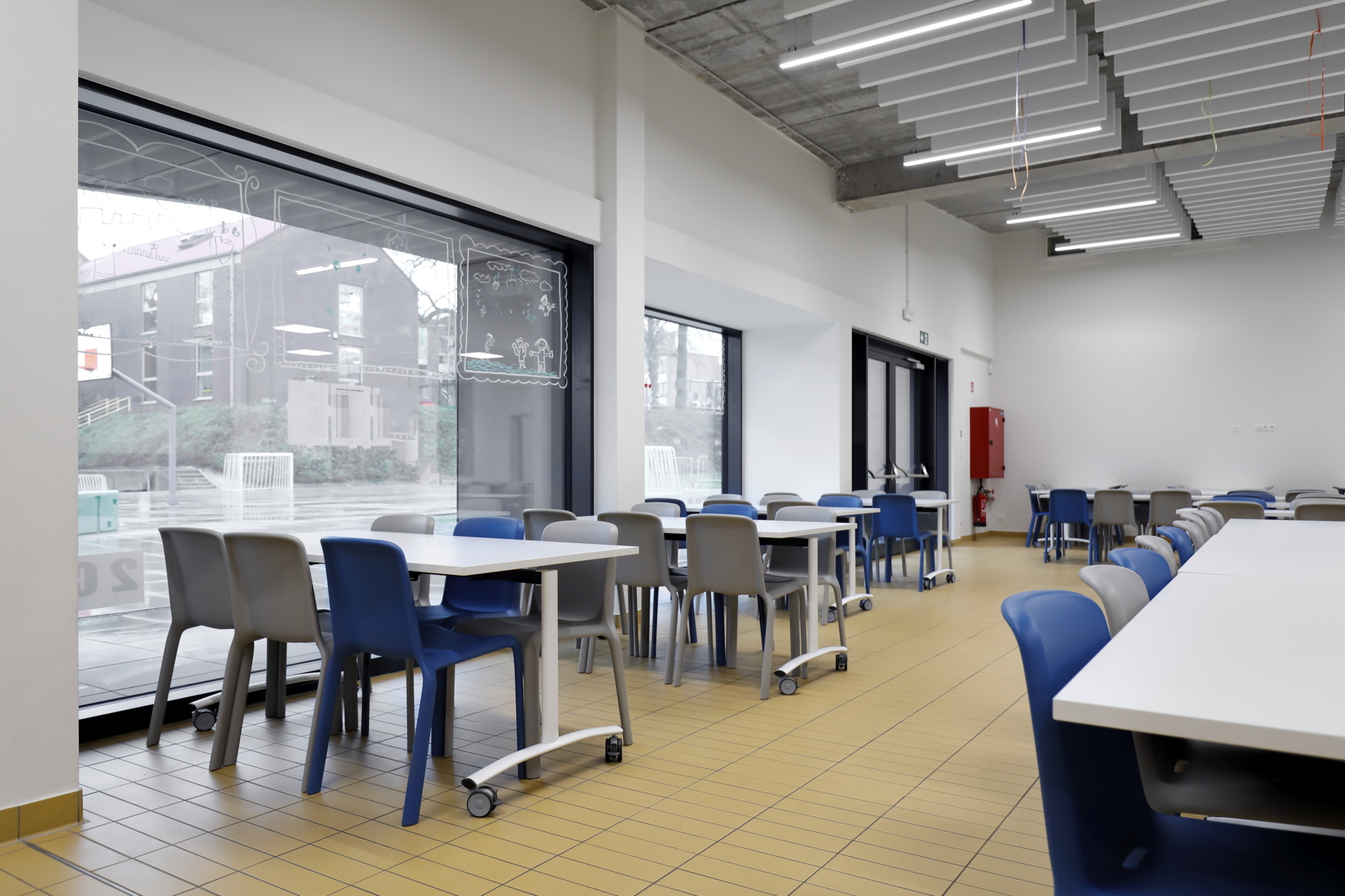 De bouw van de polyvalente ruimte bracht ook nieuw en flexibele meubilair met zich mee.
